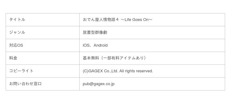 株式会社GAGEX(ガジェックス)(本社:東京都墨田区、代表取締役:井村 剣介)は、スマートフォン向けアプリ「おでん屋人情物語4 ~Life Goes On~」の事前登録を開始いたしました。本作は累計600万ダウンロードを達成した人気シリーズの最新作です。