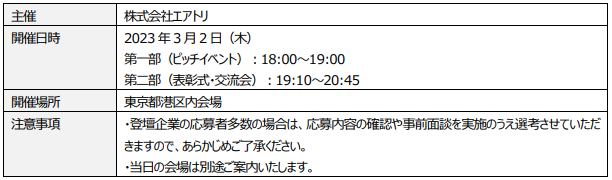 当日は、都内会場にて、1社10分程度(現時点の想定です。)でピッチを行っていただき、エアトリ CVC の経営メンバー及び既存投資先企業の代表者の投票により決定した最優秀企業を表彰いたします。