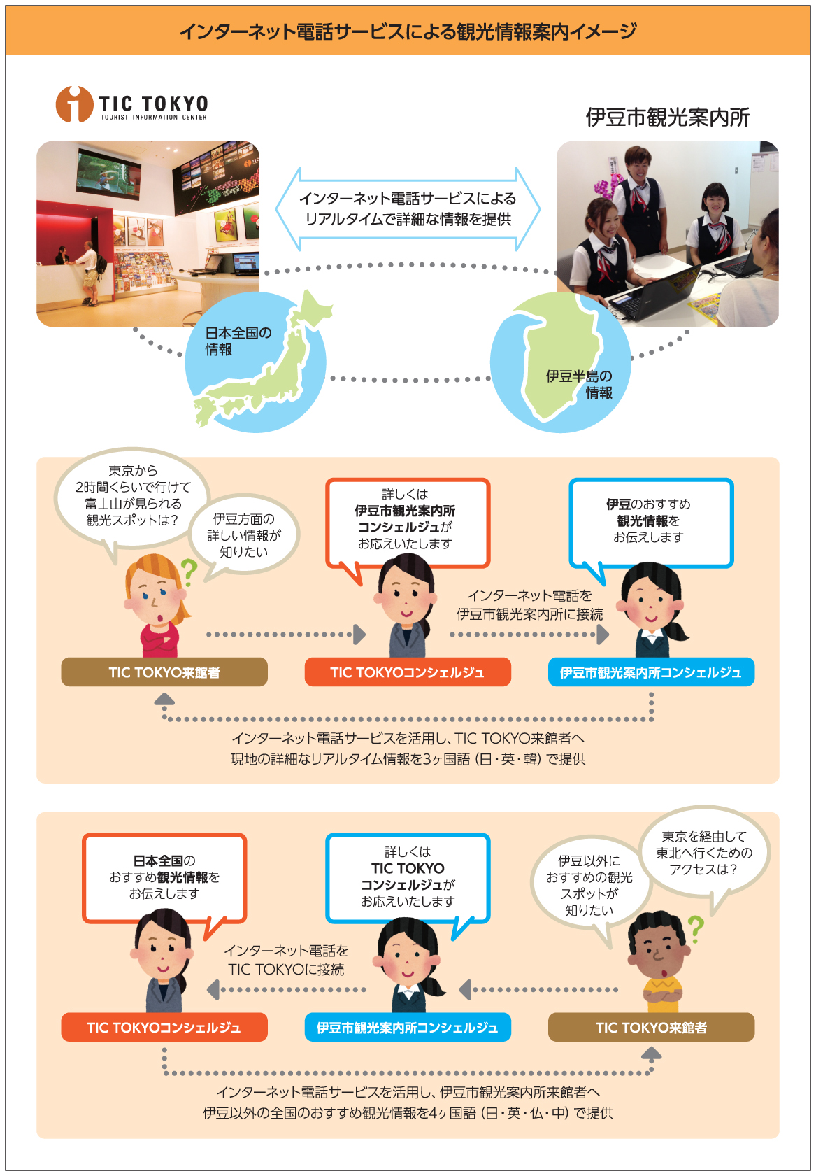 内容:TIC TOKYO(日・英・仏・中の4ヶ国語対応)と伊豆市観光案内所(日・英・韓の3ヶ国語対応)のインターネット電話サービスを活用した相互通信による来館者への観光案内
