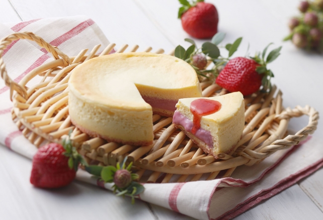 いちごの美味しさをとじこめたチーズケーキ!クリームチーズを使用してふわっとした食感に仕上げたスフレチーズケーキの中に、福岡県特産『博多あまおう苺』を使用したとろりとした口あたりの苺カスタードクリームが入っています。別添えのあまおう苺ソースをかけて、さらに苺づくしの味わいに。