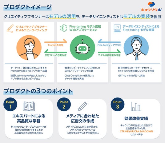 株式会社D2C R(本社:東京都港区、代表取締役社長:豊永 雅史、以下「D2C R」)は、株式会社D2C(本社:東京都港区、代表取締役社長:高田 了、以下「D2C」)のマーケティングテクノロジー本部と共に開発した広告テキスト生成AI「キョウソウAI for text」(以下、キョウソウAI)のFine-tuningモデルを「GPT-4o mini」にアップデートいたしました。