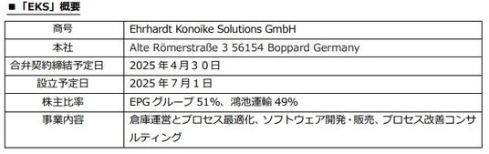 鴻池運輸株式会社 (本社:大阪市中央区、代表取締役会長兼社長執行役員 鴻池 忠彦、以下 鴻池運輸)は、ドイツ連邦共和国(以下 ドイツ)のEhrhardt(エアハート) and(アンド) Partner(パートナー) Group(グループ)(本社:ドイツ・ボッパルト市、代表者 Marco(マルコ) Ehrhardt(エアハート)、以下 EPGグループ)の子会社である、Ehrhardt(エアハート) Software(ソフトウェア)-Solutions(ソリューションズ) und(ウント) Service(サービス) GmbH(ゲーエムベーハー) (本社:ドイツ・エンメルトハウゼン市、代表者 Marco(マルコ) Ehrhardt(エアハート))および Ehrhardt(エアハート) and(アンド) Partner(パートナー) Logistics(ロジスティクス) GmbH(ゲーエムベーハー)(本社:ドイツ・ボッパルト市、代表者 Marco(マルコ) Ehrhardt(エアハート))と共同出資による合弁会社Ehrhardt(エアハート) Konoike(コウノイケ) Solutions(ソリューションズ) GmbH(ゲーエムベーハー)(本社:ドイツ・ボッパルト市、以下 EKS)を設立することを、2025年4月17日開催の取締役会にて決議しました。EKSは、ドイツの先端技術を実装する、物流業界における革新的なソリューションの開発・提供を目指します。鴻池運輸では、ドイツで初めての合弁会社設立となります。