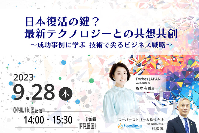 キヤノンマーケティングジャパングループのスーパーストリーム株式会社(本社:東京都品川区、代表取締役社長:村松 昇、以下スーパーストリーム)は、2023年9月28日(木)にオンラインにて「日本復活の鍵?最新テクノロジーとの共想共創~成功事例に学ぶ 技術で尖るビジネス戦略~」セミナーを開催いたします。Forbes JAPAN Web編集長 谷本 有香氏をお迎えし、最新テクノロジーをどうビジネスに取り入れるかについて成功事例を交えてご講演頂きます。