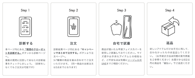 返品時の送料も無料のため、自宅で手持ちアイテムと合わせられる等、着回しの幅を体感いただけるサービスです。スタイリスト監修の「厳選5着」により、着回しの幅がグッと広がる体験を届けられることを願っています。