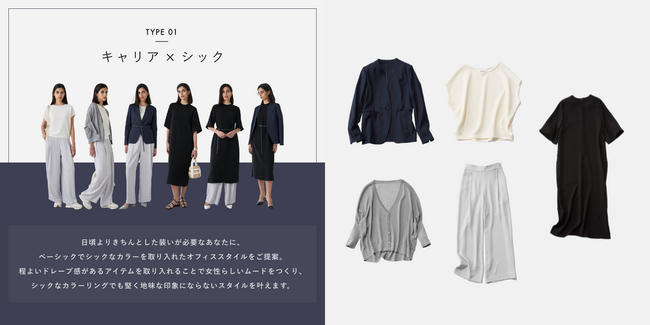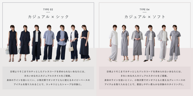今回の無料WEB診断は2023年5月19日(金)に公開し、現在累計診断回数は17,000回を突破しました。診断要素には、日頃からきちんとした服装を求められジャケットが必要な「キャリア」タイプと、そうではない「カジュアル」タイプに分けられています。さらにテイストの好みとして「シック」または「ソフト」の2タイプを掛け合わせ、大きく分類し全部で4タイプの診断結果を用意しています。さらに診断を深めたい方には、ボトムスの好みや体型に基づくおすすめアイテムを提案。加えて入力された体型データを元に、各アイテムのおすすめサイズも確認いただけるため、お買い物の参考にしていただけます。