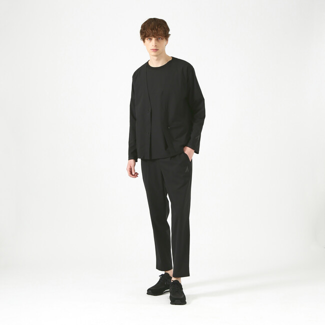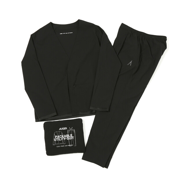 外出時や旅先で重宝するワンマイルウェア発想のセットアップアイテム。持ち運びの際には、付属のケースに畳んで収納することが出来る仕様となっています。AUGERと5351プール・オム共通のブランドカラーであるブラックをベースとしたシックなデザイン。スタイリッシュなカーディガンとイージータックパンツのセットアップのため、外出時はもちろんルームウェアとしても幅広いシーンで着用が可能。少しだけリラックス感のあるシルエットに、軽い生地の組み合わせが、心地よい着心地を生み出します。帝人フロンティアが開発した機能素材「MINOTECH(R)」を使用しており、雨などを弾く「撥水性」と着用時の蒸れを外に放出する「透湿機能」を兼ね備えているためグルーミング時など水濡れが心配なシチュエーションにも最適。