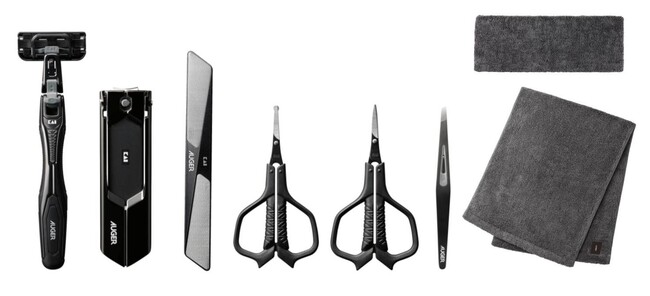 オリジナルポーチ付き限定セットには、「AUGER」ブランドのシステムカミソリ、ツメキリM Revolver、ネイルファイル、オシャレハサミ、セーフティハサミ、毛抜き、ヘアバンド、タオルがラインナップ。それらを全て収納できる「5351POUR LES HOMMES」のオリジナルポーチを含む計9アイテムがセットになったプレミアムな限定商品です。ご自宅でのフェイス、ボディのお手入れのほかに、外出時や旅先にもこのポーチ一つで身だしなみを整えることができます。