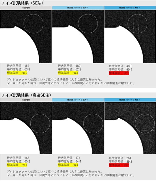 MRI撮像条件として一般的なSE法および高速SE法を用いた検証の結果、本製品の使用によるホワイトノイズの発生は確認されず、特殊シールド処理の有効性が確認されました。