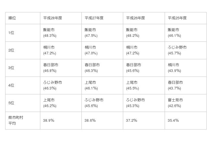 平成28年度における国民健康保険加入者の特定健康診査受診率が発表され、飯能市は埼玉県内40市中第1位となり、平成25年度から、4年連続で第1位となりました。