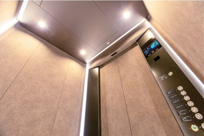 高級感あふれる空間を演出するかご内デザインです。アンビエンスは、かご内に降り注ぐ優しい光が、乗客の皆さんを包み込むような空間を作り出します。ナチュラルでモダンな雰囲気は、現代的な建物との調和を図ります。
