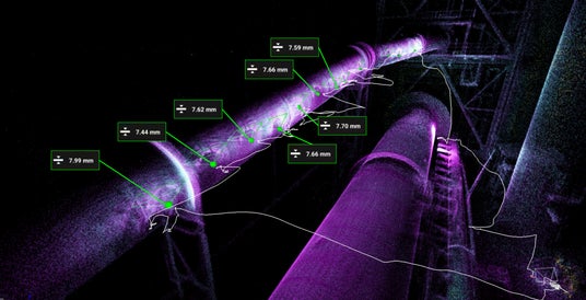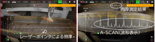 UT検査ペイロードは、プローブヘッドからレーザーポインタが照射されており、パイロットは照準を定めて対象を測定することが可能です。測定結果は、リアルタイムで表示されるほか、ELIOS 3 の飛行位置情報と共に記録され、飛行後の解析時に位置特定が可能です。