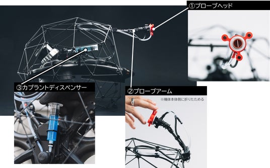 プローブヘッドとELIOS 3 のガード部分を接続します。プローブアームは、狭いマンホールの通過時や、複雑な空間内で飛行の妨げにならないよう、機体本体側に折りたためるように設計されています。