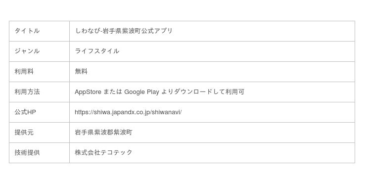 株式会社テコテック(本社:東京都港区、代表取締役社長:釣崎 宏)は株式会社エルテス(本社:東京都千代田区、代表取締役:菅原 貴弘)と、その100%出資子会社である株式会社JAPANDX(本社:東京都千代田区、代表取締役:菅原 貴弘)の開発する住民総合ポータルアプリ「しわなび-岩手県紫波町公式アプリ」の機能開発を担当致しましたのでお知らせ致します。