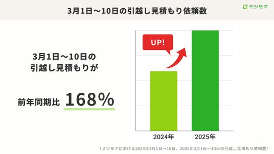 株式会社ミツモア(以下、ミツモア 本社:東京都中央区、代表取締役:石川彩子)が運営する、オンラインでの見積もり比較・受発注サービス「ミツモア」では、2025年3月1日~10日の引越し見積もり依頼数が、前年同期比で168%に増加しました。繁忙期に入り「引越し難民」が急増する中で、複数業者への同時見積もりが可能なミツモアは、引越しの需要増に対応できる解決策を提供します。