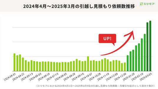 2024年4月から2025年3月までの週次データによると、1月から引越し見積もり依頼が増加しはじめ、2025年2月後半以降にさらに急激な伸びを見せています。