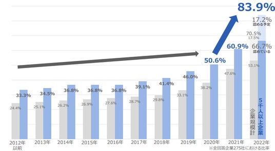 ※1【社外への送出:認めている企業の推移 5000人以上企業・企業規模計】2022年10月11日 一般社団法人 日本経済団体連合会「副業・兼業に関するアンケート調査」https://www.keidanren.or.jp/policy/2022/090.pdf