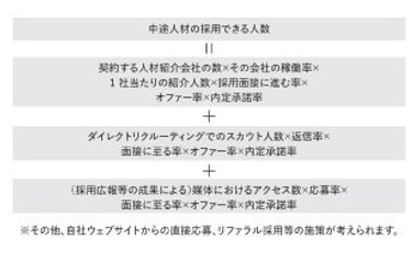 「業務を分解して、施策を考える」という考え方は採用にも適用できます。分解ができたら、「どの因数をあげるべきか」を自社の戦略や目的と、アップサイド(とコストやリスク)の観点から、優先順位を決めましょう。例えば、中途人材の採用人数を確保したければ、計算式は図のようになります。