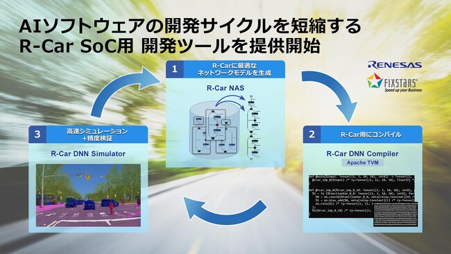 ルネサス エレクトロニクス株式会社(代表取締役社長兼CEO:柴田 英利、以下ルネサス)と株式会社フィックスターズ(代表取締役社長 三木 聡、以下フィックスターズ)は、AD(自動運転)/ADAS(高度運転支援システム)向けソフトウェアをルネサスの車載用SoC(System on Chip)R-Carに最適化し、高速にシミュレーションできるツール群を共同開発しました。ソフトウェア開発の初期段階においてR-Carの性能を活かした認識精度の高いネットワークモデルを早期に開発できます。これにより、開発の手戻りを低減し、開発サイクルの短縮が可能です。第一弾として、最大34TOPS(Tera Operations Per Second)のディープラーニング性能を低消費電力で実現するAD/ADAS用「R-Car V4H」向けのツールを本日より提供開始します。