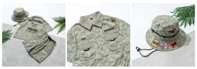 恐竜のカモフラージュ総柄に、ワッペンがたくさんついたスペシャルなアイテム。セットアップとサファリハットのフルコーデで、まるで恐竜研究者になれる!恐竜好きのお子様におすすめです。