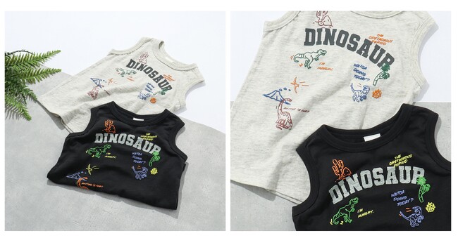 いろんな恐竜が発泡プリントされているタンクトップ。カジュアルなカレッジデザインがポイントです。