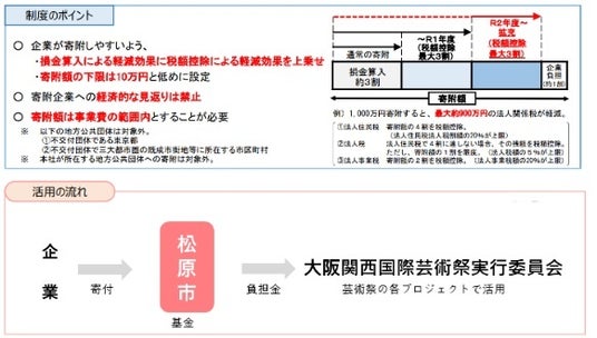 今回の芸術祭を活用した地方創生の財源として、松原市(大阪府)の企業版ふるさと納税が活用されます。企業版ふるさと納税(地方創生応援税制)は、国が認定した自治体の地方創生プロジェクトに対し企業が寄附を行った場合に、税制上の優遇措置が受けられる仕組みです。2020年度税制改正により、税額控除額の申請手続きの簡素化など大幅な見直しが実施されました。これにより寄附を行う企業の法人関係税の負担割合は最大約9割軽減されることとなり、今後、制度を活用する企業が増え、地方創生事業への民間資金の活用が進むと想定されます。また、大阪府松原市が窓口になることによって大阪市をはじめ、全国の企業も寄付することが可能なものとなります。