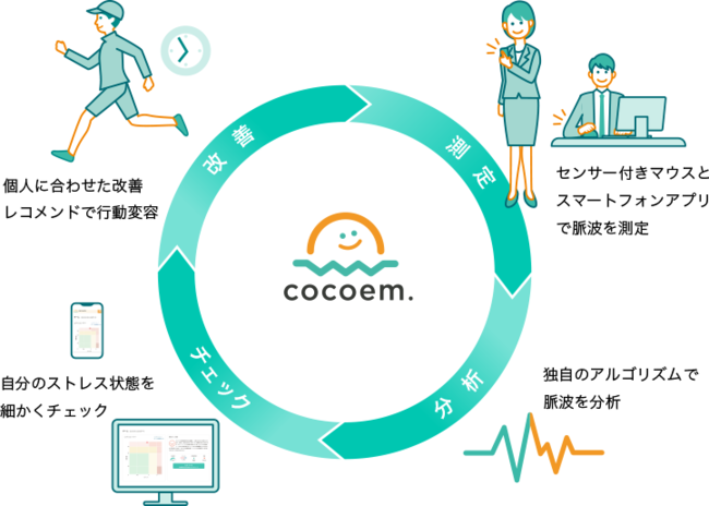 「cocoem.」は、日々の脳疲労・ストレスを定量的に見える化し、改善提案を促す「メンタルヘルスケア」サービスです。就業中に触れる機会の多いPCマウスやスマートフォンアプリで、従業員が手軽に脳疲労やストレスを日々測定・分析でき、変化を「見える化」します。