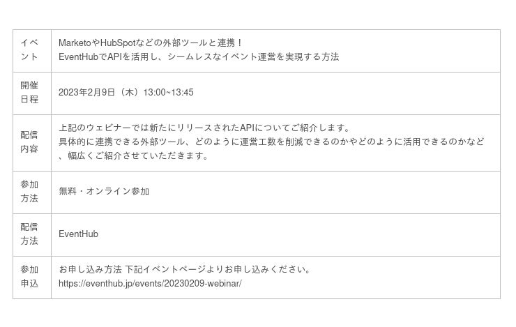 株式会社EventHub (東京都中央区、代表取締役CEO:山本 理恵) が提供するイベントマーケティングプラットフォーム「EventHub(イベントハブ)」は、1月18日より日本発のイベントマーケティングプラットフォームとして初(※1)となるAPIを公開しました。API連携の第一弾としてAdobe Marketo EngageとHubSpotの2つのMAツールとの連携を開始したことをお知らせします。