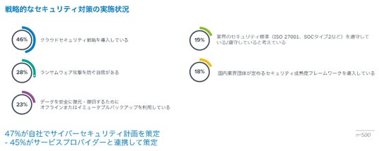 調査対象のほぼすべての企業が、セキュリティ計画を策定していると回答しています。しかし、ランサムウェア攻撃を防ぐ自信があると回答した企業は、約4分の1(28%)に留まっています。さらに、50%の企業が、多くの重要なセキュリティ管理は、社内で対応できていると感じていました。セキュリティ侵害発生時や発生後、社外への情報提供を行っていないという回答は16%、社内への情報提供を行っていないという回答も16%となり、それぞれ約6社に1社となりました。