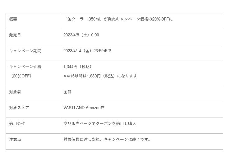 VASTLAND株式会社(本社:兵庫県姫路市/代表:田中悠貴)が運営するキャンプギアブランド「VASTLAND(ヴァストランド)」は、缶のまますっぽり収まり、外気の熱の影響を受けにくい真空二重構造で冷たさをキープする「缶クーラー 350ml」を2023/4/8(土)にAmazon店で先行発売することを決定しました。また発売を記念して、Amazon店限定で20%OFFの価格で購入できる「発売キャンペーン」を開催します。