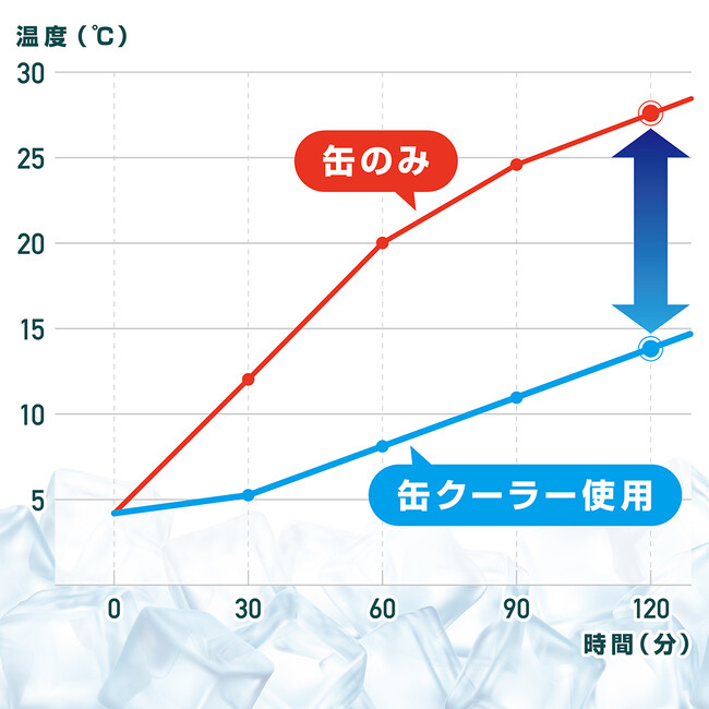 4℃に冷やしたアルミ缶を30℃の環境下で2時間放置した結果、缶クーラーなしと比べて13.7℃の温度差を確認。