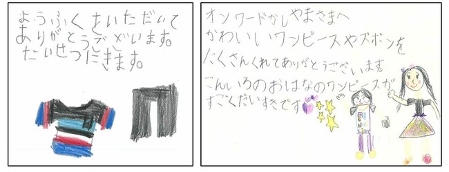 送られてくる写真は、素敵な洋服を着て満面の笑顔の顔・顔・顔。お礼の手紙には「かわいいお洋服ありがとう」「かっこいいお洋服ありがとう」「学校に着ていきます」と、タドタドしい文字がいっぱい。オンワード樫山様へのお礼状が事務所に届きます。