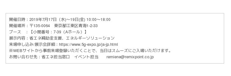 常に新市場に挑戦し、新たな価値を提供し続ける株式会社リミックスポイント(証券コード:3825、本社:東京都港区六本木3丁目2番1号、代表取締役会長兼社長CEO 小田玄紀(以下「当社」)は、2019年7月17日(水)~19日(金)に東京ビッグサイト「青海展示棟」にて開催される、5G・IoTなど次世代のモバイル通信業界最大のイベント「5G/loT通信展」に出展いたします。
