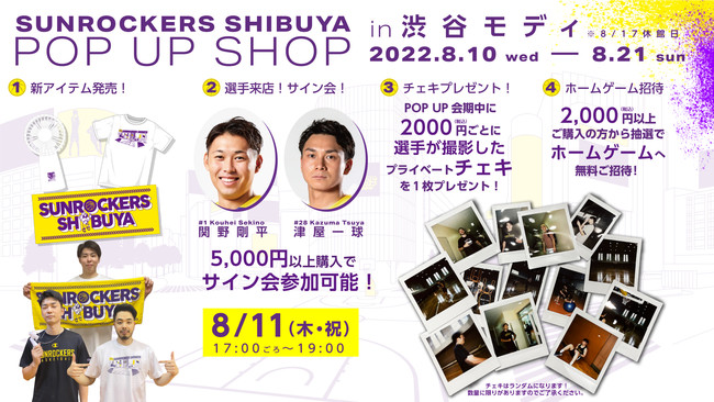 渋谷モディに8月10日(水)~8月21日(日)の期間限定でオフィシャルグッズショップ「サンロッカーズ渋谷 POP UP SHOP in 渋谷モディ」をオープンいたします。期間中はチェキプレゼントやホームゲーム招待などのキャンペーンに加えて、選手のサイン会も予定しております。