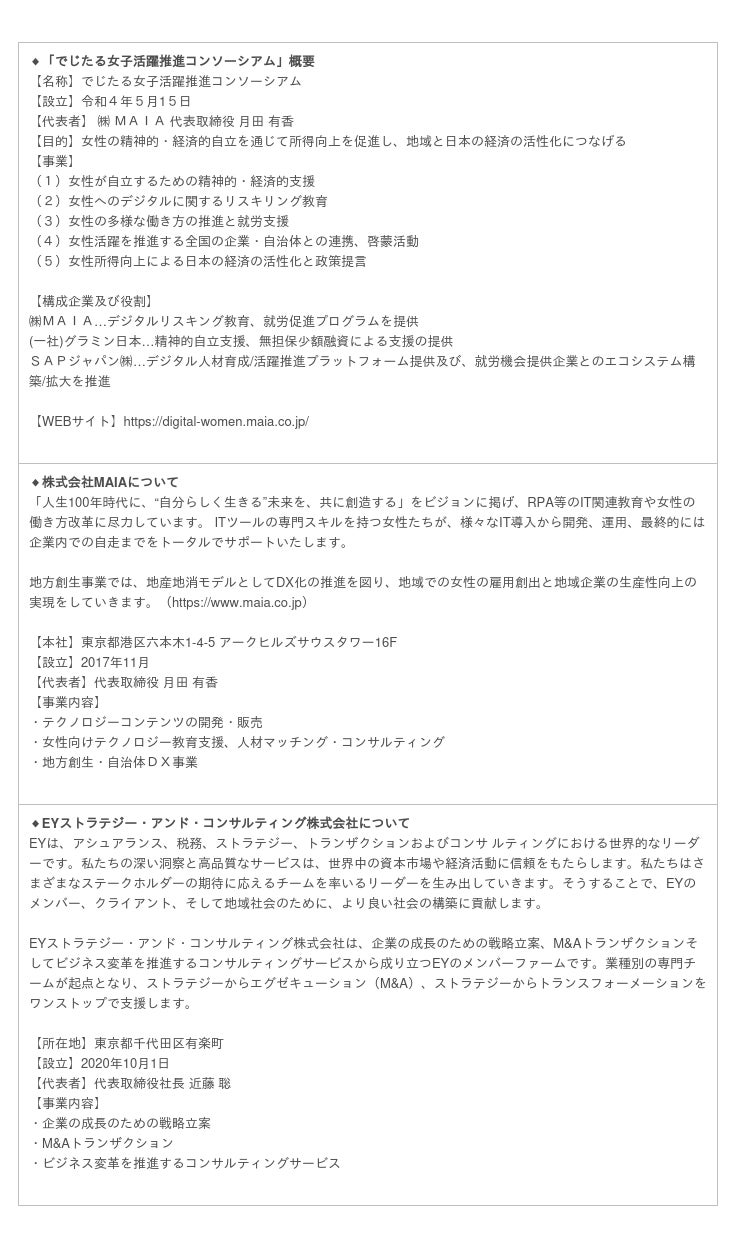 株式会社MAIA(本社:東京都港区、代表取締役:月田 有香、以下「MAIA」)が主幹事を務める「でじたる女子活躍推進コンソーシアム」と鹿児島市(市長:下鶴 隆央)で連携協定を結び実施している実証事業「かごしまデジタル女性(おごじょ)プロジェクト」に、EYストラテジー・アンド・コンサルティング株式会社(東京都千代田区、代表取締役社長:近藤 聡、以下EYSC)が参加者のビジネススキルの向上を目指すワークショップなどの教育コンテンツを提供します。またEYSCは、「でじたる女子活躍推進コンソーシアム」の趣旨に賛同するタレント採用パートナーに参画しました。