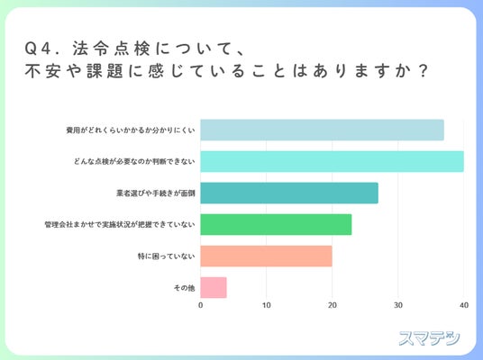 法令点検に関する不安や課題(複数回答可)で最も多かったのは、「どんな点検が必要なのか判断できない」(40名)でした。次いで「費用がどれくらいかかるか分かりにくい」(37名)、「業者選びや手続きが面倒」(27名)と続き、8割以上のオーナーが、情報不足やプロセスの煩雑さに起因する何らかの課題を抱えていることが分かりました。