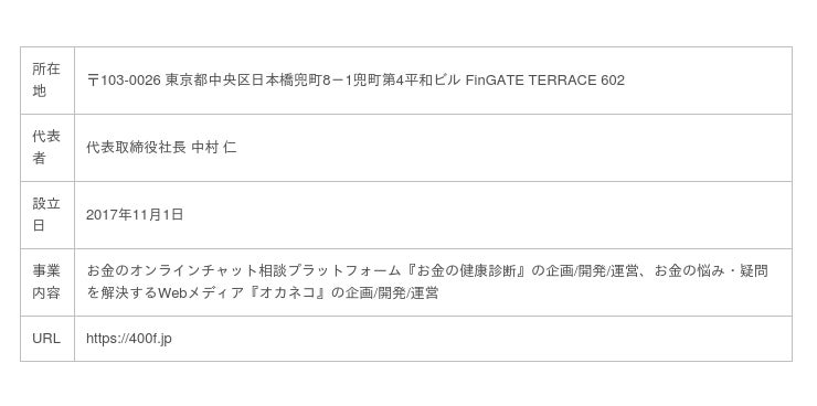 株式会社400F(フォーハンドレッド・エフ)は、2017年11月に設立、翌年2018年11月、お金のオンラインチャット相談プラットフォーム『お金の健康診断』正式リリース。2019年11月、お金の悩み・疑問を解決するWebメディア『オカネコ』正式リリース。2020年7月、MBOにより株式会社お金のデザインから独立し事業運営を開始。社名の「400F」には、ゴッホの生前に唯一売れた作品で当時400フラン(約11万円)ほどの値段だった言われる絵画『赤い葡萄畑』が、のちに名画としてその価値を大きく伸ばしたように、無限大の可能性を持ち続ける企業を目指していきたいという想いを込めています。
