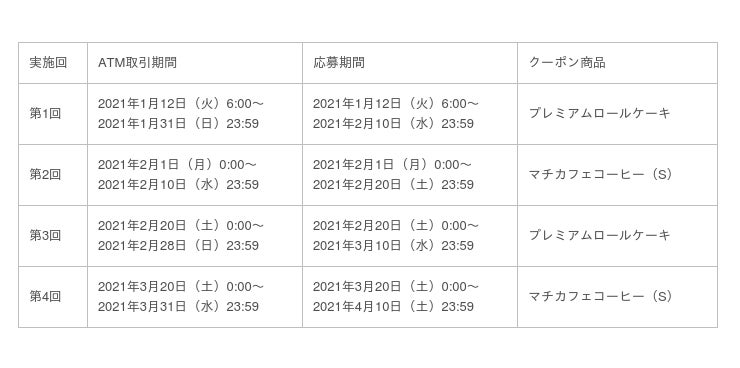 期間中にローソン銀行ATMで対象のお取引をしたSBIレミットのお客さまに、ローソンで使える無料クーポンを合計4回プレゼントいたします。無料クーポン第1回(ATM取引期間:2021年1月12日(火)6時~1月31日(月)23時59分、応募期間:2021年1月12日(火)6時~2月10日(水)23時59分)の対象商品は、「プレミアムロールケーキ」です。