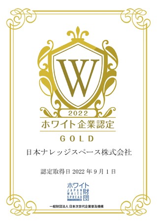 2022年9月1日、日本ナレッジスペース株式会社が、一般財団法人日本次世代企業普及機構(通称:ホワイト財団)が運営する「ホワイト企業認定 ゴールド」を取得しましたことをお知らせいたします。