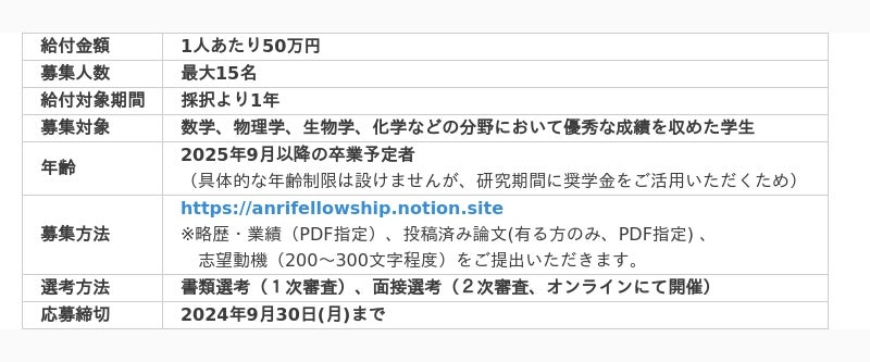 「The ANRI Fellowship」では、選考に通過した学生最大15名に対し、1人あたり50万円の奨学金を給付いたします。下記、概要をご確認の上、お申し込みください。