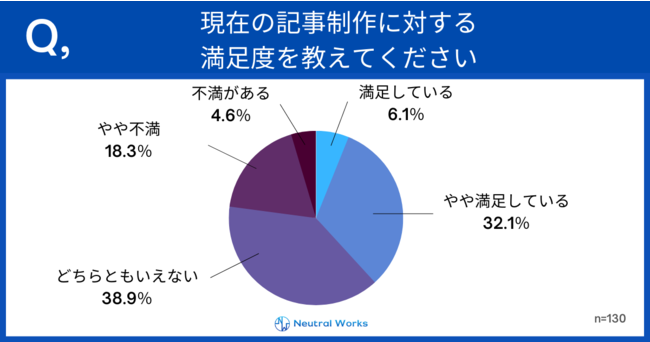 デジタルマーケティング支援をしている株式会社ニュートラルワークス(神奈川県茅ヶ崎市 代表取締役:三木五月、以下「ニュートラルワークス」)は、自社コラムやオウンドメディアなどを運営している企業に所属の方130名を対象に、記事制作に関する実態調査を行いました。