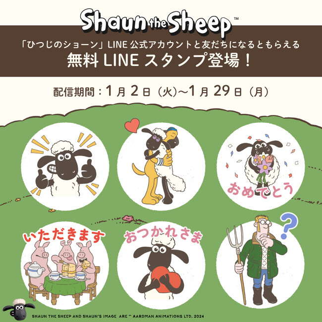 株式会社東北新社(本社:東京都港区)がライセンスを所有するイギリス発クレイ・アニメーション「ひつじのショーン」は、2024年1月14日(日)に公式オンラインショップをリニューアルして2周年を迎えます。これを記念し、この度1月2日(火)11:00頃より無料LINEスタンプの配布を開始いたします。さらに、オンラインショップ内にて2周年記念アイテムの発売に始まり、お得に買い物ができるポイントプレゼントゲーム、会員限定セール、クーポン配布なども実施いたします。2024年も「ひつじのショーン」をよろしくお願いいたします。