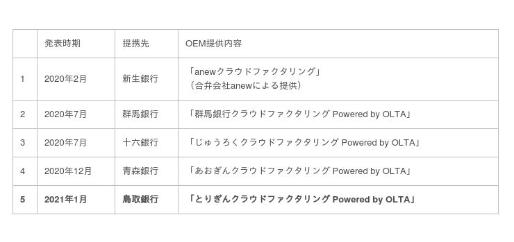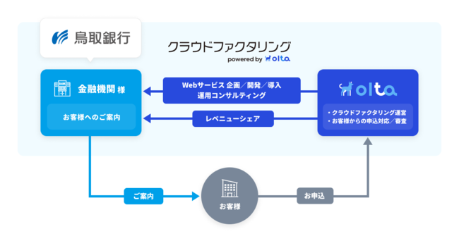 国内初のオンライン完結型ファクタリングサービス「クラウドファクタリング」を提供するOLTA株式会社(代表取締役社長兼CEO:澤岻 優紀、以下、OLTA)は、株式会社鳥取銀行(取締役頭取:平井 耕司、以下、鳥取銀行)に「クラウドファクタリング事業」をOEM提供し、2021年2月1日より「とりぎんクラウドファクタリング powered by OLTA 」を開始いたします。