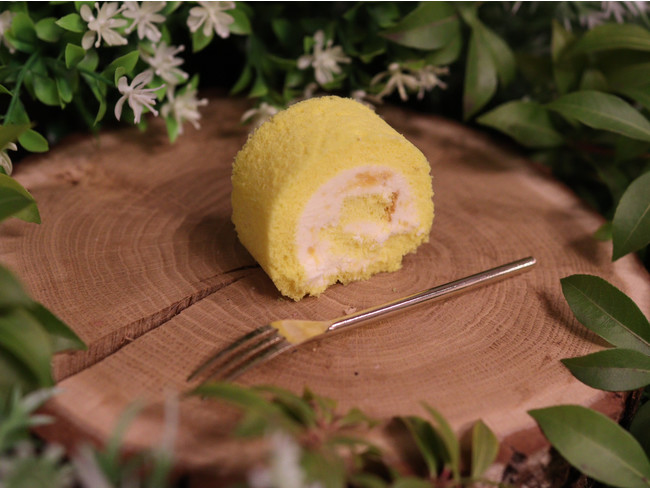 濃縮マンゴーを混ぜて黄色くしマンゴー味にした北海道産のスポンジにさらに純生クリームとチーズにも濃縮マンゴーの果肉をいれたマンゴー×チーズ味のミニロールケーキ