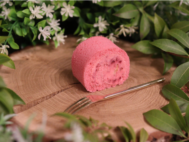 ラズベリー濃縮果汁を北海道産の卵で作るスポンジに混ぜ、さらに果肉入りの濃縮ラズベリーを純生クリームチーズと調合したラズベリー×チーズ味のミニロールケーキ