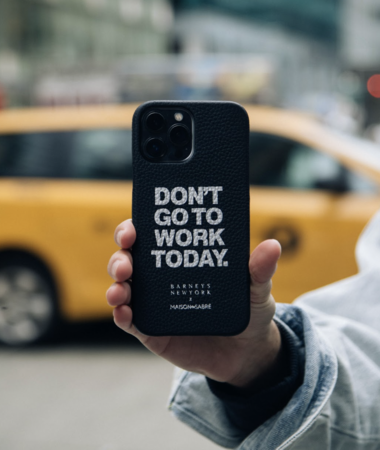 大胆でぱっと目を引くDON’T GO TO WORK TODAY.のスローガンが刻印されたスマホケース。MAISON de SABRÉとBarneys New Yorkのブランドロゴも刻印された世界にひとつのオリジナルケース。刻印カラーはNew Yorkのようなモダンでクールな街並みをイメージし、ミラーのようなメタリック調シルバーを採用。ぱっと鞄から取り出すだけで強い存在感を放つシックでクールなデザインに。