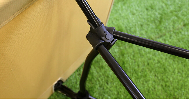 全フレームにショックコードが採用されているので、初めてコットを使用する方でも組み立て方に迷うことなくスムーズに設置することができます。実際に当社のキャンプ未経験の女性社員が組み立てを行った際は、最短2分で設置が完了しました。サイドフレームにレッグフレームを取り付ける際も、付属のロックレバーを使用してしっかりと固定できるので安心です。また、市場ではサイドフレームのみにショックコードが採用されているコットが多い中、当製品はレッグフレームにもショックコードが採用されているので、ロータイプからハイタイプへの切り替えも約20秒で簡単に完了します。