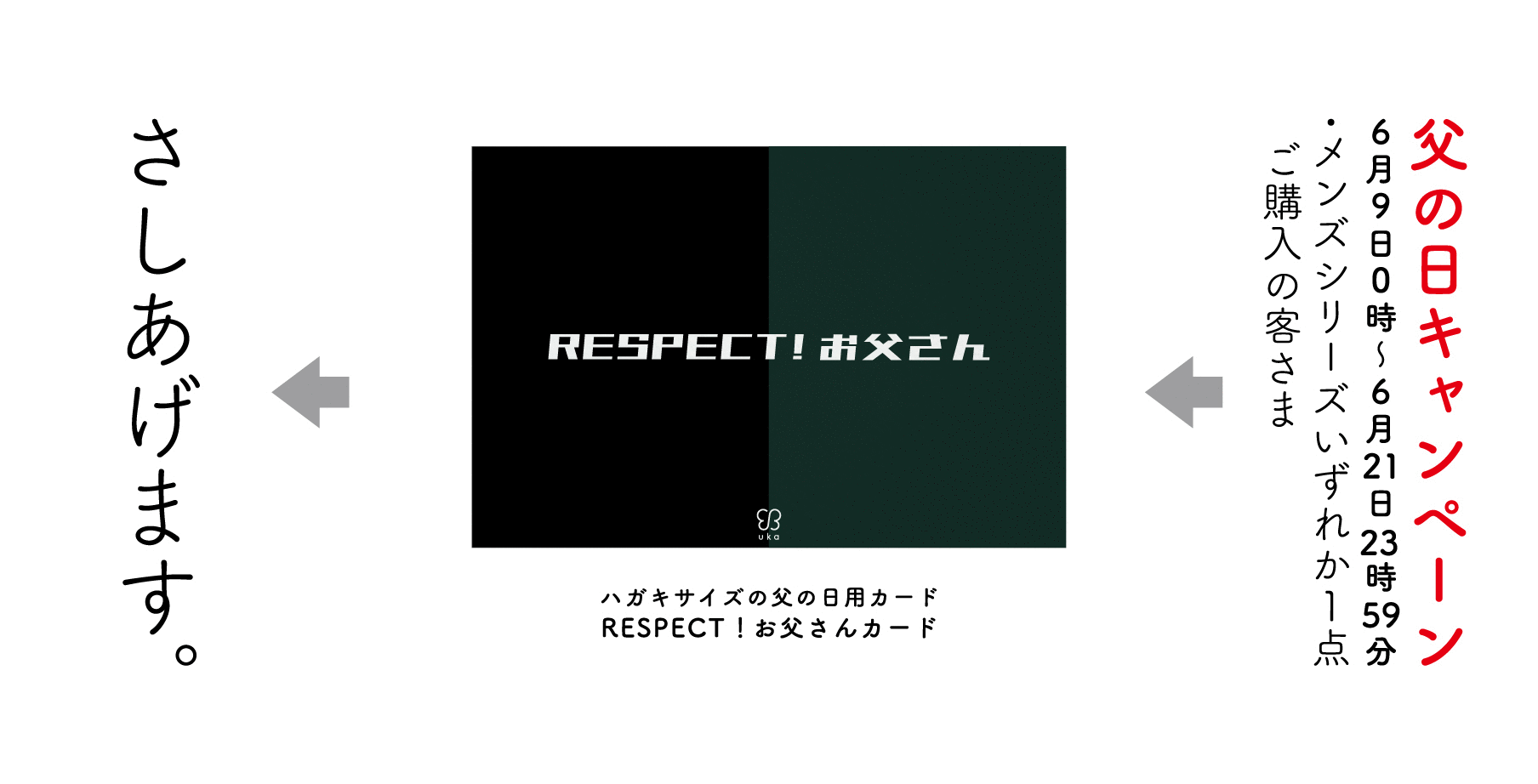 今回の商品は6月9日よりukakauで予約注文をスタートいたします。また父の日のキャンペーンといたしまして、メンズシリーズのいずれか一点以上購入の方に「Respect お父さん」カードプレゼントさせていただきます。