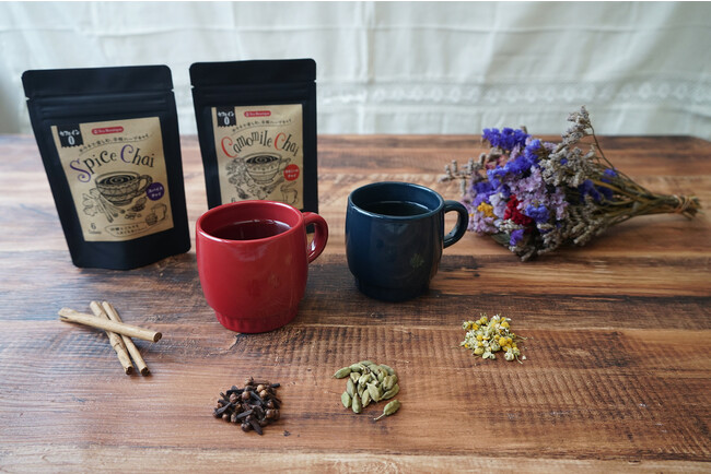7種のハーブとスパイスをブレンドした、力強い味わいの「スパイスチャイ」と、チャイではめずらしいカモミールとスパイスをブレンドした「カモミールチャイ」の2種類のラインナップ。