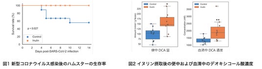 ● ハムスターを通常食(コントロール群)と5%イヌリン添加食(注2)を摂取させる群に分け、摂取2週間後に新型コロナウイルス(SARS-CoV-2)を経鼻感染させました。その結果、コントロール群では感染10日後の生存率が60%であったのに対して、5%イヌリン添加食を与えたハムスターでは、生存率が100%でした(図1)。