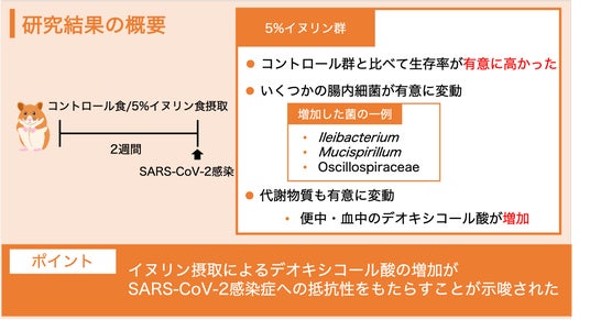 このような中、両社、およびメタジェン代表の福田が特任教授を務める慶大先端生命研、ならびにウイルス特異的免疫応答の制御機構の研究を進める東大医科研の一戸猛志准教授は、イヌリンが免疫機能に及ぼす効果に関する論文が世界的に多数報告されていることから、新型コロナウイルス感染症の重症化に対するイヌリンの予防効果について 動物試験で検証することとし、2020年12月から共同研究を行ってきました。